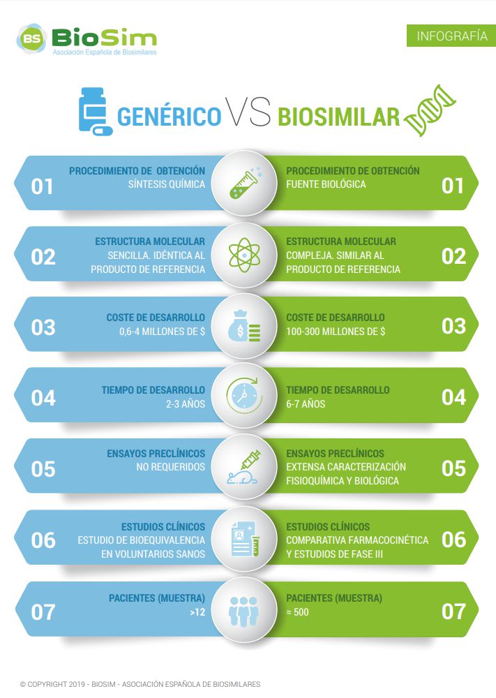 Infografía sobre las principales diferencias entre un medicamento biosimilar y un medicamento genérico