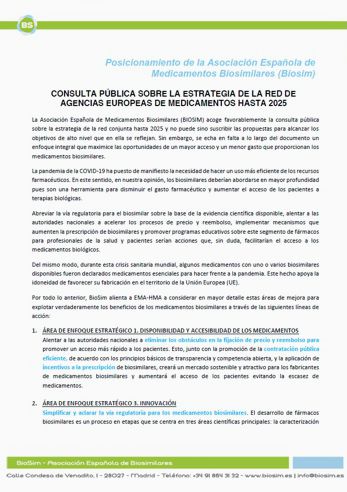 La Asociación Española de Medicamentos Biosimilares (BIOSIM) acoge favorablemente la consulta pública sobre la estrategia de la red conjunta hasta 2025 y no puede sino suscribir las propuestas para alcanzar los objetivos de alto nivel que en ella se reflejan. Sin embargo, se echa en falta a lo largo del documento un enfoque integral que maximice las oportunidades de un mayor acceso y un menor gasto que proporcionan los medicamentos biosimilares.